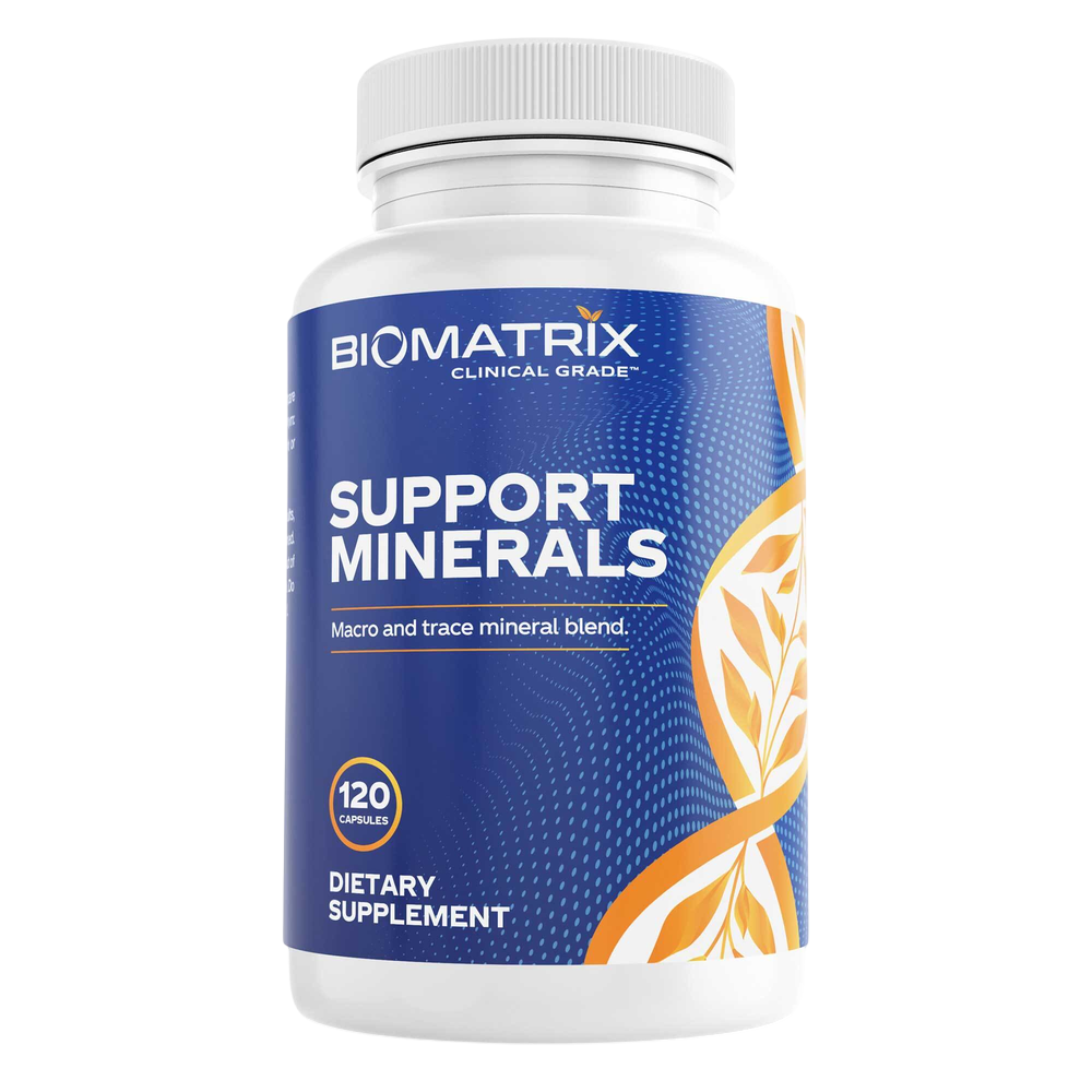 Chelated Mineral Supplement Support Minerals is a full-spectrum chelated mineral supplement delivering bioavailable macro and trace minerals using TRAACS and Albion amino acid chelation technology to support absorption and minimize gastrointestinal distress. Calcium and magnesium in a 2:1 ratio support bone density and neuromuscular relaxation. Zinc and copper in a balanced ratio support immunity and connective tissue synthesis. Selenium and chromium contribute to antioxidant defense and glucose metabolism. Manganese, molybdenum, and iodine support essential enzymatic cofactor functions. Chelated mineral forms avoid the absorption limitations of non-chelated oxides and carbonates, supporting consistent outcomes in patients with malabsorption tendencies or digestive sensitivity. Supports daily mineral supplement needs, bone health, metabolic function, and electrolyte balance. Dosing Guidance Suggested Use is based on general population needs. Practitioners may wish to titrate based on patient presentation, lab values, or combined nutrient strategy. BioMatrix can advise on sequencing with vitamins, amino acids, and targeted protocols.