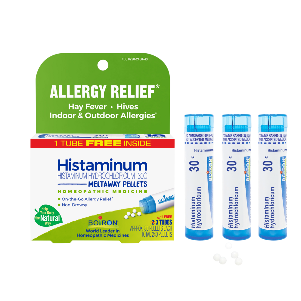 Boiron Histaminum pellets relieve symptoms of allergic conditions, including hay fever symptoms and hives.* A homeopathic medicine, Histaminum hydrochloricum 30C does not cause drowsiness, or interactions with other medications or supplements. It will not mask symptoms of a more serious condition. Easy to take, the pellets melt under the tongue without water, chewing, or swallowing pills. The Boiron Histaminum 30C Pellets Pack offers three easy dispensing tubes of Histaminum 30C pellets for the price of two. With approximately 80 oral pellets per tube, this over-the-counter value pack provides approximately 48 doses. Boiron's allergy line includes AllergyCalm™ tablets and pellets and SinusCalm Allergy.