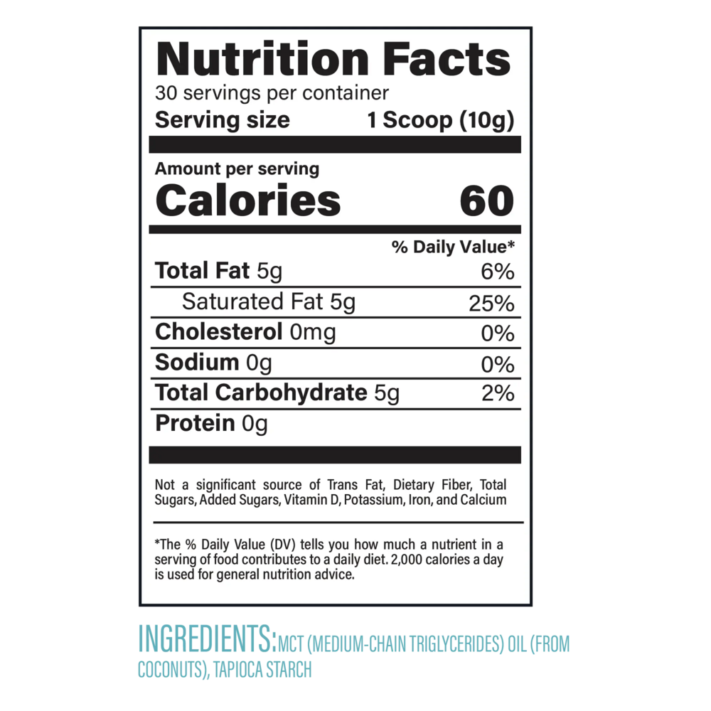 Ingredients: MCT (Medium-chain triglycerides) oil (from coconuts), tapioca starch.