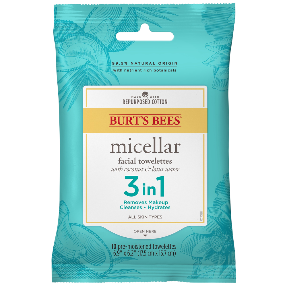 Burt's Bees paired Coconut and Lotus Water with our micellar technology in an easy-to-use towelette. It easily lifts away dirt and oils, and there’s no need to rinse. These towelettes are made from soft-as-silk repurposed cotton, but are strong enough to remove a day's worth of makeup with ease.