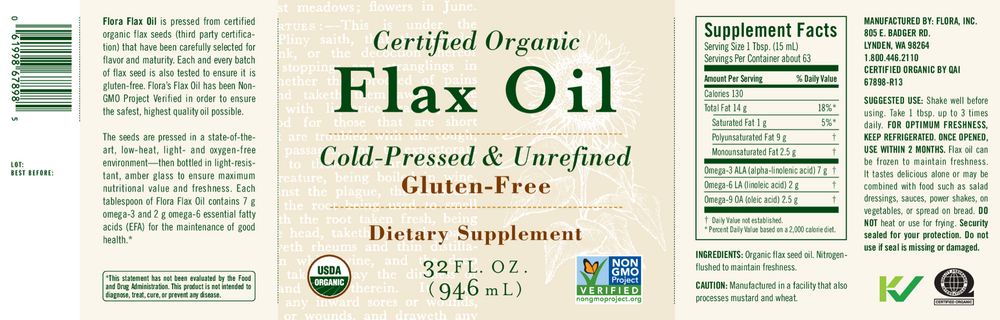 Shake well before using. Take 1 tbsp. up to 3 times daily. FOR OPTIMUM FRESHNESS, KEEP REFRIGERATED. ONCE OPENED, USE WITHIN 2 MONTHS. Flax oil can be frozen to maintain freshness. It tastes delicious alone or may be combined with food such as salad dressings, sauces, power shakes, on vegetables, or spread on bread.