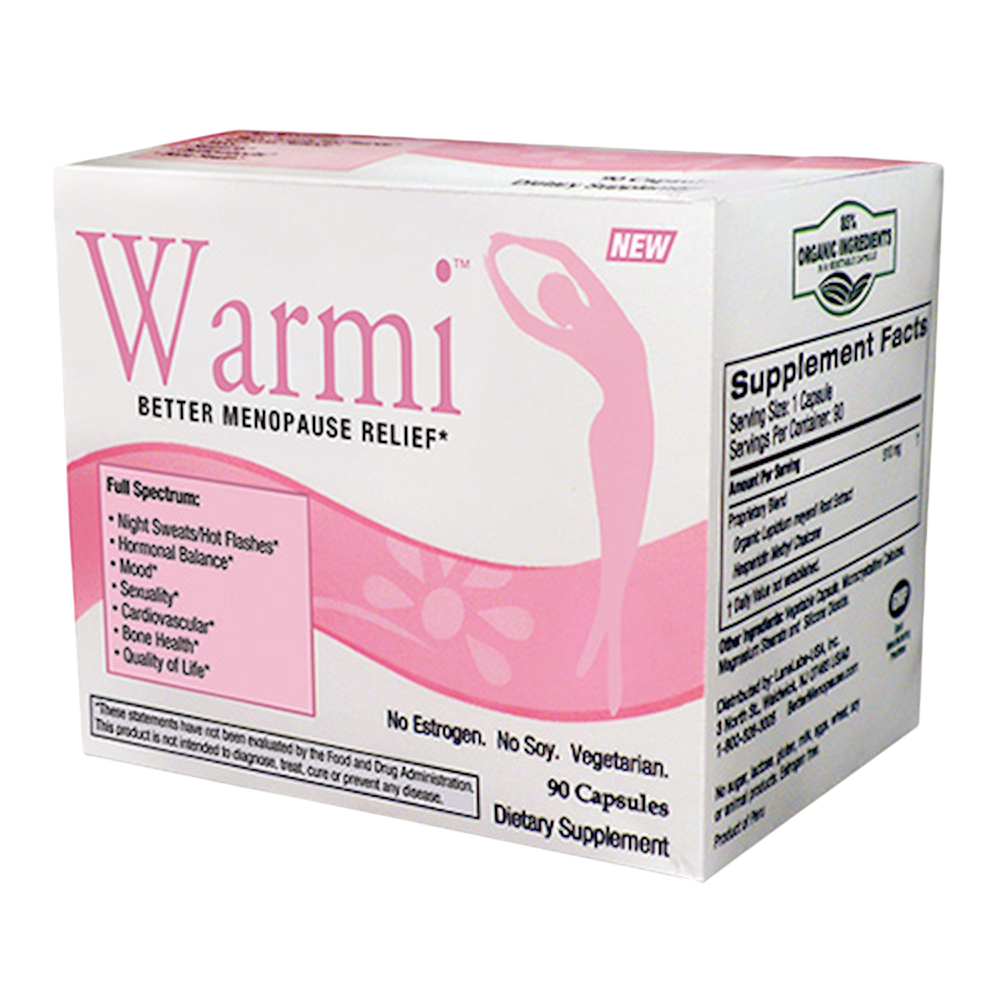 Warmi provides safe, natural, full spectrum menopause relief. Warmi is a unique vegetable and fruit extract supplement, containing 85% organic ingredients in a vegetable capsule. It’s been clinically tested safe and effective in over 200 women. With Warmi, women experienced fewer hot flashes, night sweats, balanced hormones, calm moods, less vaginal dryness. Warmi is estrogen free with no hormones, soy isoflavones, lactose, dairy or gluten.*