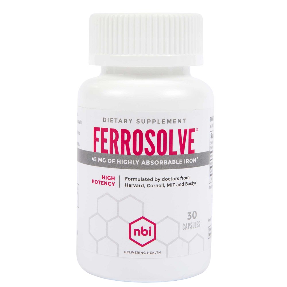 "• Promotes healthy iron levels and normal red blood cell production, 45 mg of iron per capsule."• Supports oxygen supply to tissues and organs• Supports healthy brain and muscle function• GI safe• High potencycontains a highly absorbable, chelated form of iron to promote and maintain healthy iron levels. Studies show that the unique form of iron in FerroSolve is up to 75% absorbable and doesn’t cause gastrointestinal upset like other forms of iron can.45 mg of iron per capsule."
