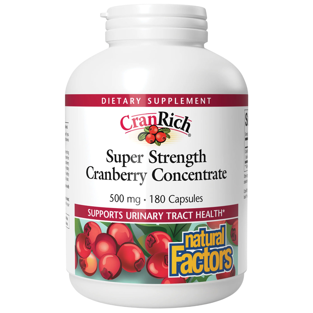 CranRich provides a superior source of cranberry’s unique health promoting compounds. The formula is a potent source of cranberry powder containing a very high 36:1 ratio of concentration. (This means that 36 grams of cranberries equals 1 gram of concentrate.) The supplements are also more convenient to take than cranberry juice, without the added sugar.*
