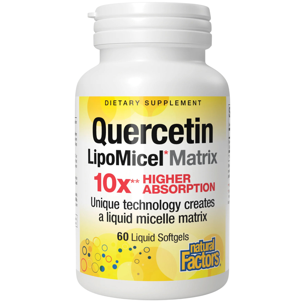 The unique antioxidants in quercetin support blood vessel and immune health. Natural Factors unique, patent-pending LipoMicel technology creates a liquid micelle matrix that disperses the quercetin into tiny micro-droplets, resulting in 10 times higher absorption than standard forms. Natural Factors’ LipoMicel technology uses self-assembling micellular technology to provide optimal absorption,