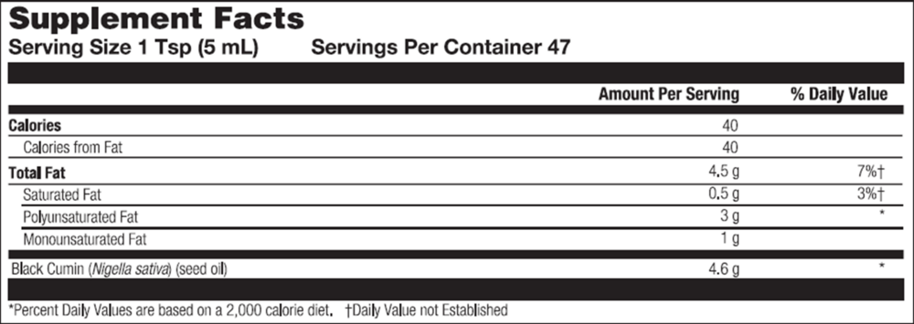Black Seed Oil 8oz is a 100% cold-pressed oil extract from Nigella sativa and contains the powerful antioxidant thymoquinone phytosterols animo acids and omega 3-6-9 fatty acids.* Black seed oil has been the subject of scientific research for its reputed benefits on cardiovascular health, immunity, cell metabolism and cytokine balance.