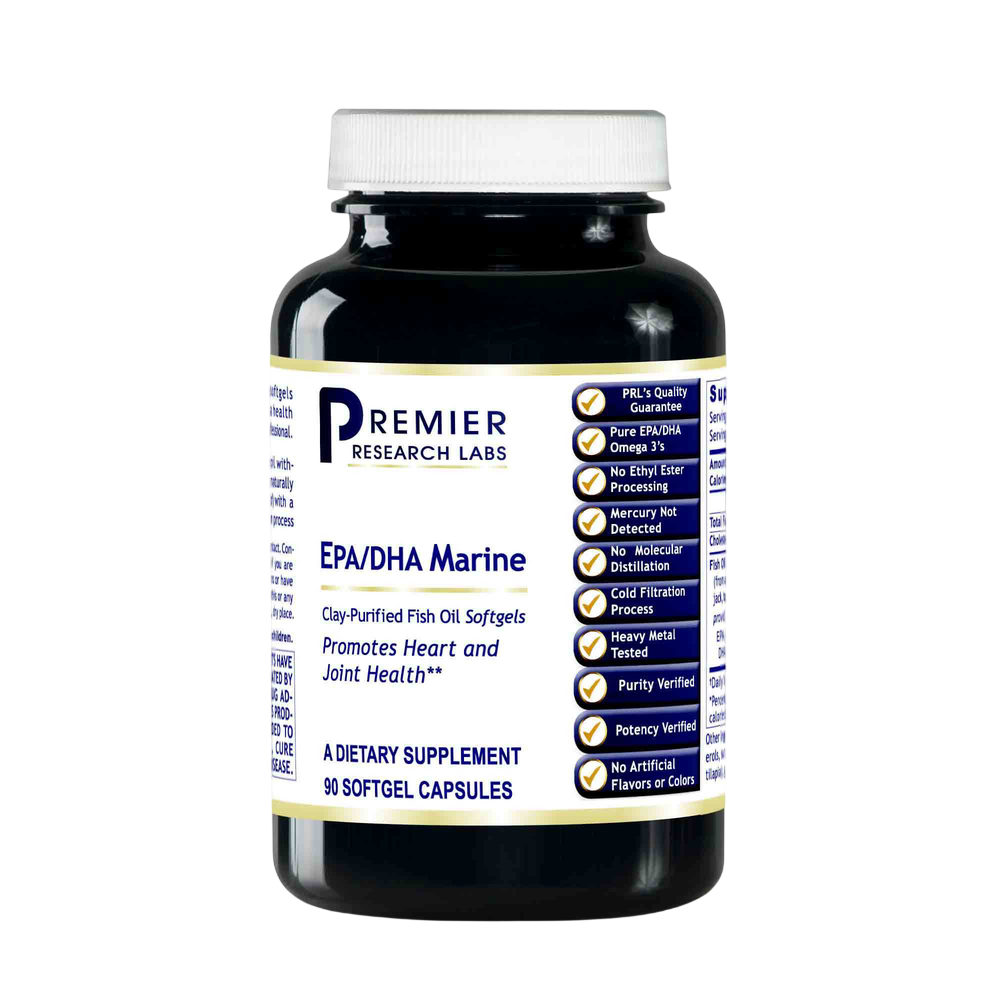 EPA/DHA Marine Softgels, Premier. Clay-Purified Fish Oil Softgels. Dietary Supplement, 90 Softgel Capsules. Promotes Heart and Joint Health.* Without molecular distillation. Naturally purified (no solvents used) with a cold filtration process.