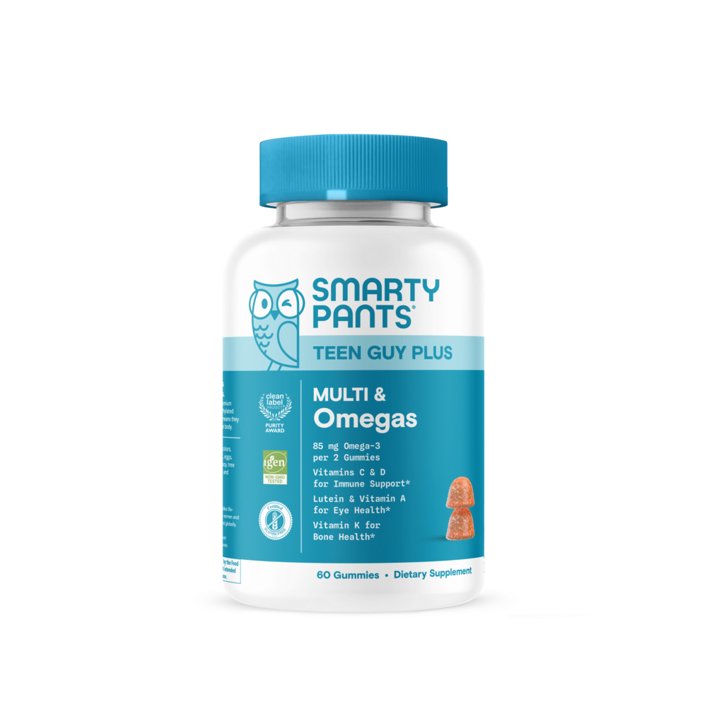 SmartyPants Teen Guy Plus Multi & Omegas is formulated with 23 nutrients to support teens’ overall health*, including vitamins D3, B12, K, selenium, folate, and Omega-3s in a delicious two-gummy serving.​ ​Our formulas include bioavailable forms of high-quality nutrients that are easy for your kids’ bodies to absorb and use methylated folate, vitamin B12 as methylcobalamin, vitamin D as D3, and zinc citrate.