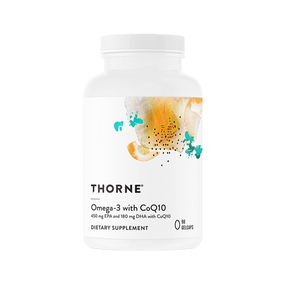 Thorne's Omega-3 w/CoQ10 offers fish oil with concentrated amounts of EPA and DHA (450 mg EPA and 180 mg DHA in each gelcap) along with CoQ10. Combining CoQ10 with fish oil provides the supportive benefits of both nutrients while enhancing the absorption of CoQ10.* Thorne provides the highest quality, purest fish oil available – and utilizing molecular distillation ensures the removal of cholesterol and contaminants, including PCBs and heavy metals.