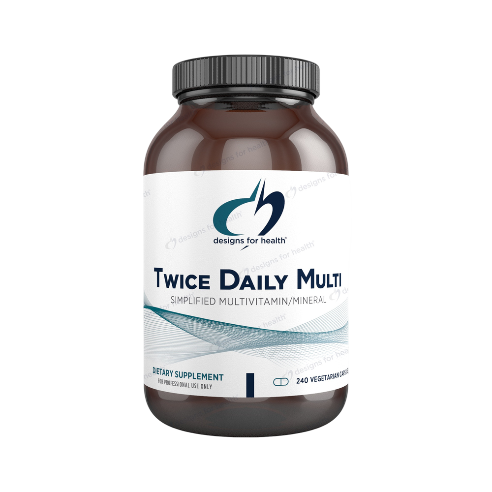 Disclaimer: ††An IPSOS 2023 survey among US functional medicine practitioners, in an average month, Designs for Health is their personally most trusted practitioner supplement brand, meaning a brand that is sold by healthcare practitioners in their office. ††An Ipsos 2023 study among a random sample of 160 functional medicine practitioners including Doctor's of Osteopathic Medicine, Pharmacists, Acupuncturists, Athletic Trainers, Personal Trainers, Fitness Trainer/Coaches, Chiropractors, Integrative Medicine Specialists, Naturopathic Doctor, Homeopaths, Medical Doctors, Physical Therapists, Nurse Practitioner/Physician Assistants, Registered Nurses, Nutritionists, Massage Therapists, Occupational Therapists and Dieticians that are aware of Designs for Health and recommend supplements to their patients. Twice Daily Multi™ contains optimal amounts of many nutrients not easily obtained in most diets. It uses higher quality ingredients than most multivitamins, including vitamin E as high gamma mixed-tocopherols, a highly bioavailable form of folate, and true amino acid chelate minerals for optimal tolerance and absorption. These exceptional ingredients are combined in an up-to-date, science-based formulation to create a truly superior multi.