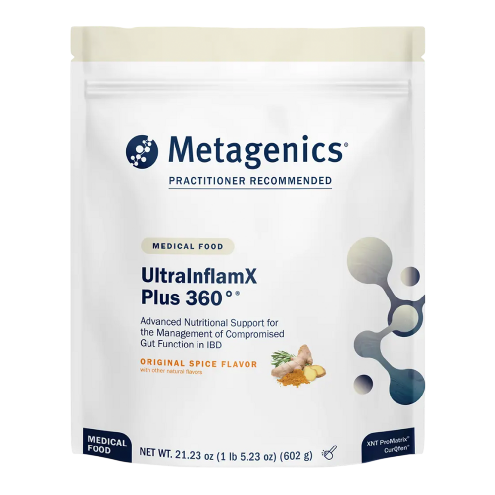 Blend (for no longer than 15 seconds), shake, or briskly stir 2 level scoops of UltraInflamX Plus 360° (43 g) into 8 fluid ounces of chilled water, juice, or acceptable fruit as listed in the dietary guidelines. Take twice per day or as recommended by your healthcare practitioner. Consume within 10 minutes of reconstitution. Refer to the UltraInflamX medical food program guide for easy-to-follow guidelines, tips, recipes, and more.