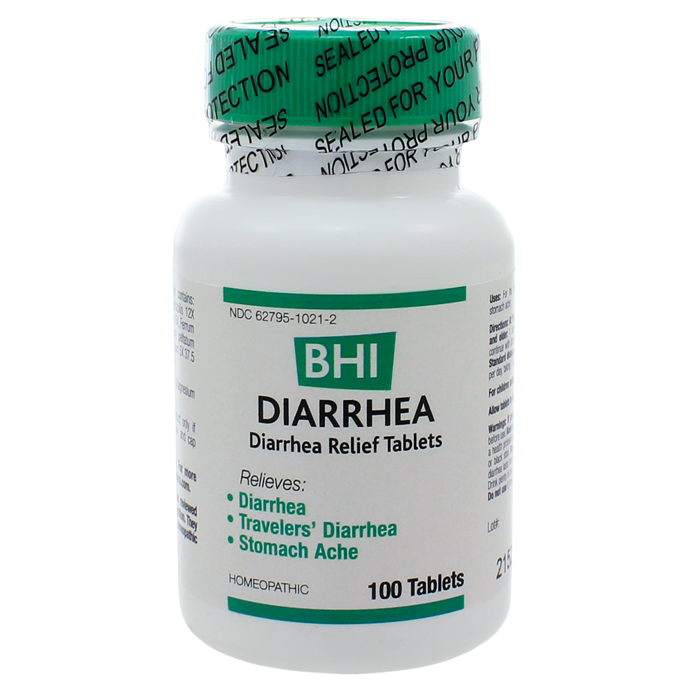 Homeopathic. Natural diarrhea relief – BHI Diarrhea tablets relieve mild diarrhea, travelers’ diarrhea and stomach ache.† • Gentle relief – 8 active ingredients including Colocynthis, a well known remedy for gently relieving spasms often accompanying diarrhea.† • Homeopathic approach – Homeopathy treats symptoms with a micro-dose of an active ingredient to stimulate the body’s own defenses. MediNatura's approach combines multiple potent actives, in multiple concentrations for greater relief of more symptoms. • Safe, effective relief – All BHI tablets have no known interactions with other medicines or supplements and are non-addictive. • Quick dissolve tablets – Easy to use, dissolvable tablets for fast, convenient relief whenever symptoms start. This safe formula can be taken daily, or as needed during symptom flare ups.