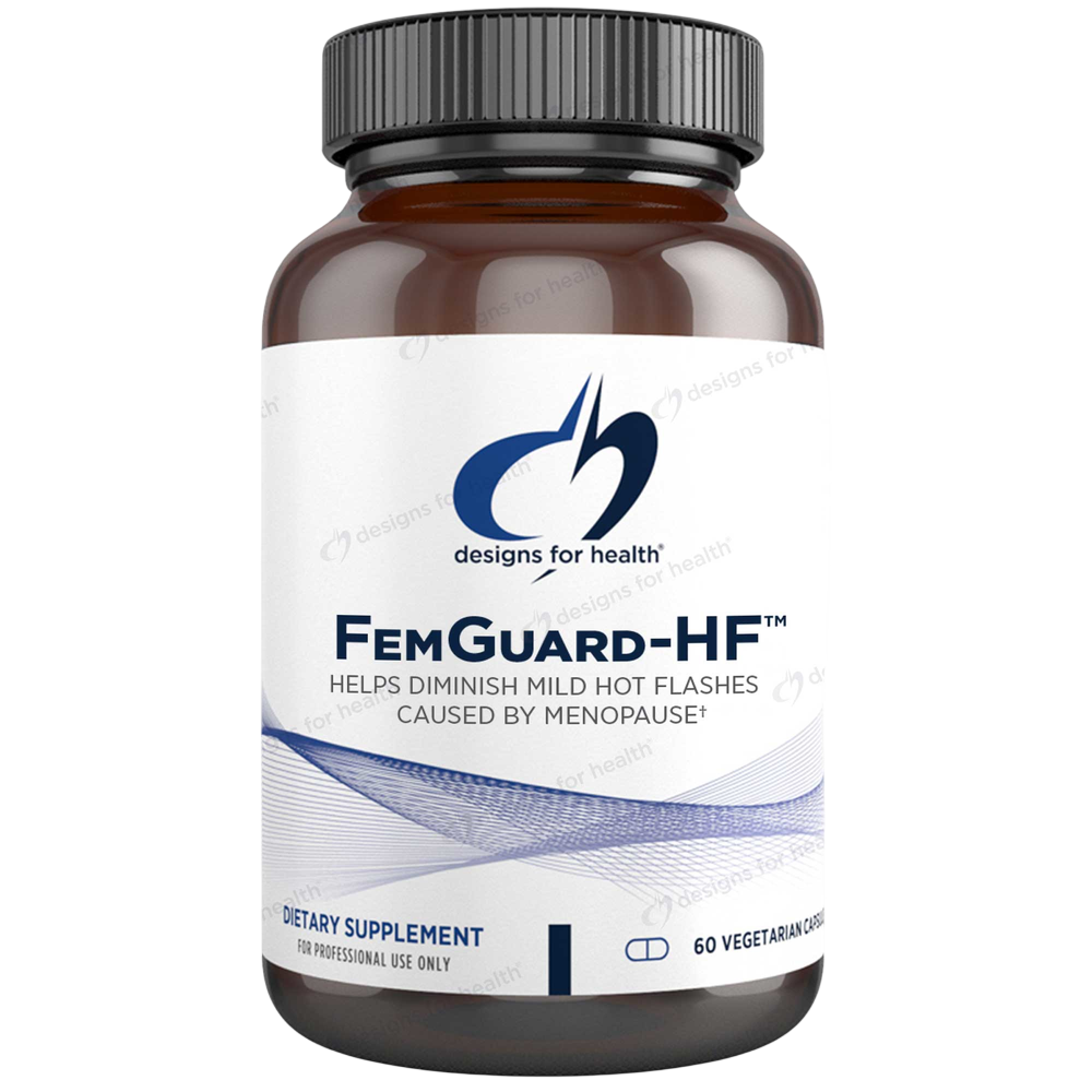 Disclaimer: ††An IPSOS 2023 survey among US functional medicine practitioners, in an average month, Designs for Health is their personally most trusted practitioner supplement brand, meaning a brand that is sold by healthcare practitioners in their office. ††An Ipsos 2023 study among a random sample of 160 functional medicine practitioners including Doctor's of Osteopathic Medicine, Pharmacists, Acupuncturists, Athletic Trainers, Personal Trainers, Fitness Trainer/Coaches, Chiropractors, Integrative Medicine Specialists, Naturopathic Doctor, Homeopaths, Medical Doctors, Physical Therapists, Nurse Practitioner/Physician Assistants, Registered Nurses, Nutritionists, Massage Therapists, Occupational Therapists and Dieticians that are aware of Designs for Health and recommend supplements to their patients. FemGuard-HF™ is designed to help diminish mild hot flashes caused by menopause and promote overall menopausal comfort.* Hot flashes are a common vasomotor complaint during menopause that can significantly affect a woman’s quality of life. This product is a synergistic combination of phytoestrogens (genistein and lignans [as HMRlignan®]), gamma-oryzanol, DeltaGold® tocotrienols, and the amino acid taurine.* This product may help promote healthy aging.* It may support healthy inflammatory and antioxidative responses to estrogen fluctuations/insufficiency, bone health, and healthy hormonal and neurotransmitter balance.*