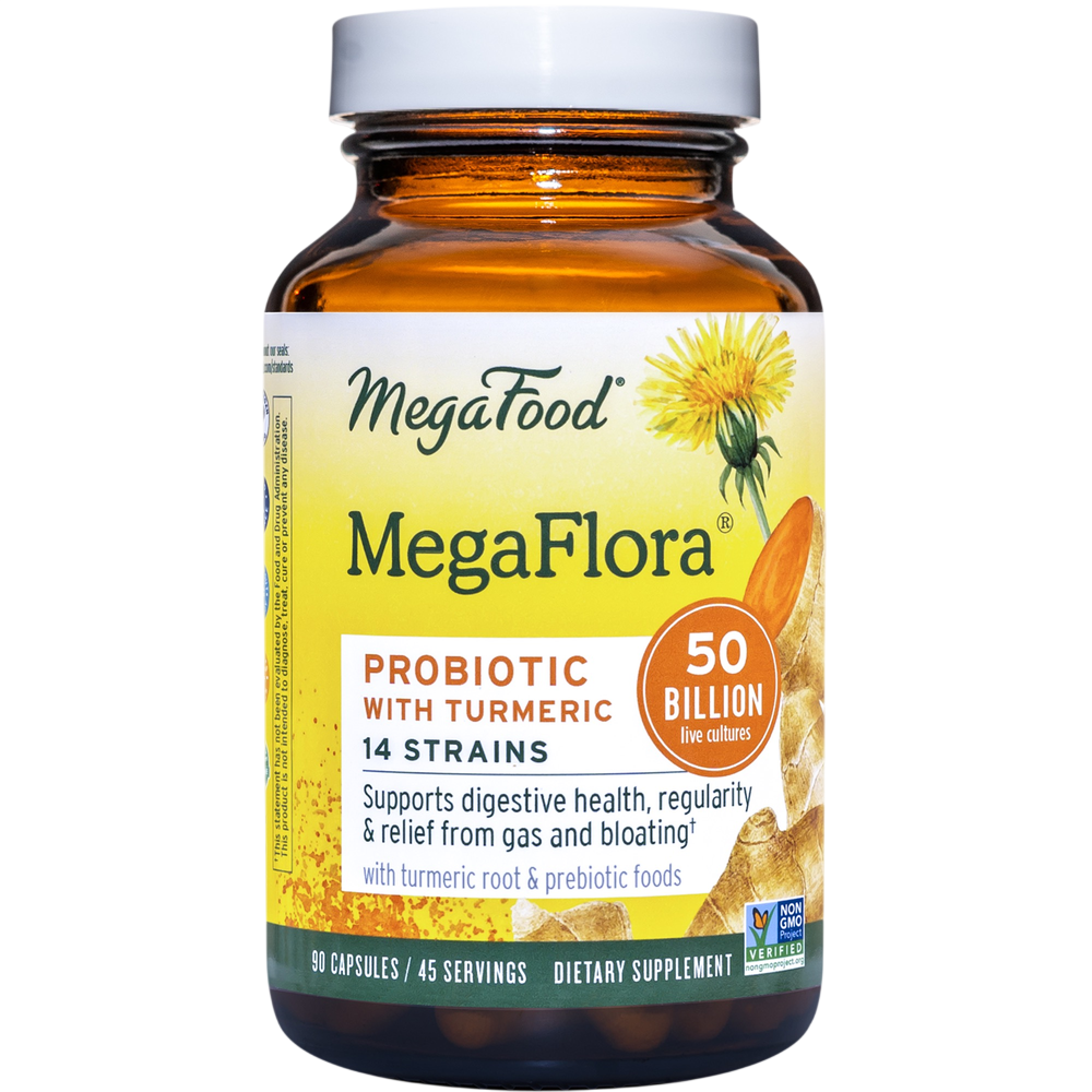 Promotes colon health, regularity & relief from gas & bloating* MegaFlora with Turmeric (formerly know as MegaFlora over 50) contains Bifidobacterium lactis (HN019) and Lactobacillus plantarum (LP115) to promote regularity, healthy bowel function and proper digestion for reduced gas and bloating in addition to Megafood's signature blend of 14 unique strains of probiotics from 50 billion active bacteria.* FoodState® Turmeric Root helps maintain an already healthy inflammatory response of the colon, and Megafood FoodState Prebiotic Blend encourages the growth of healthy gut bacteria.* Just like all MegaFood® supplements, MegaFlora with Turmeric is tested free from gluten, dairy and soy, and certified glyphosate residue free! Megafood recommend storing your MegaFlora in the fridge or freezer, and taking it once daily with a meal. • 14 unique probiotic strains, includes acid-resistant • 50 billion CFUs of active bacteria • Bifidobacterium lactis (HN019) and Lactobacillus plantarum (LP115) are included to promote regularity, healthy bowel function and proper digestion for reduced gas and bloating* • FoodState Turmeric Root helps maintain a healthy inflammation response of the colon* • FoodState Prebiotic Food Blend promotes the growth of good bacteria within the gut* • Use as part of your foundational health program