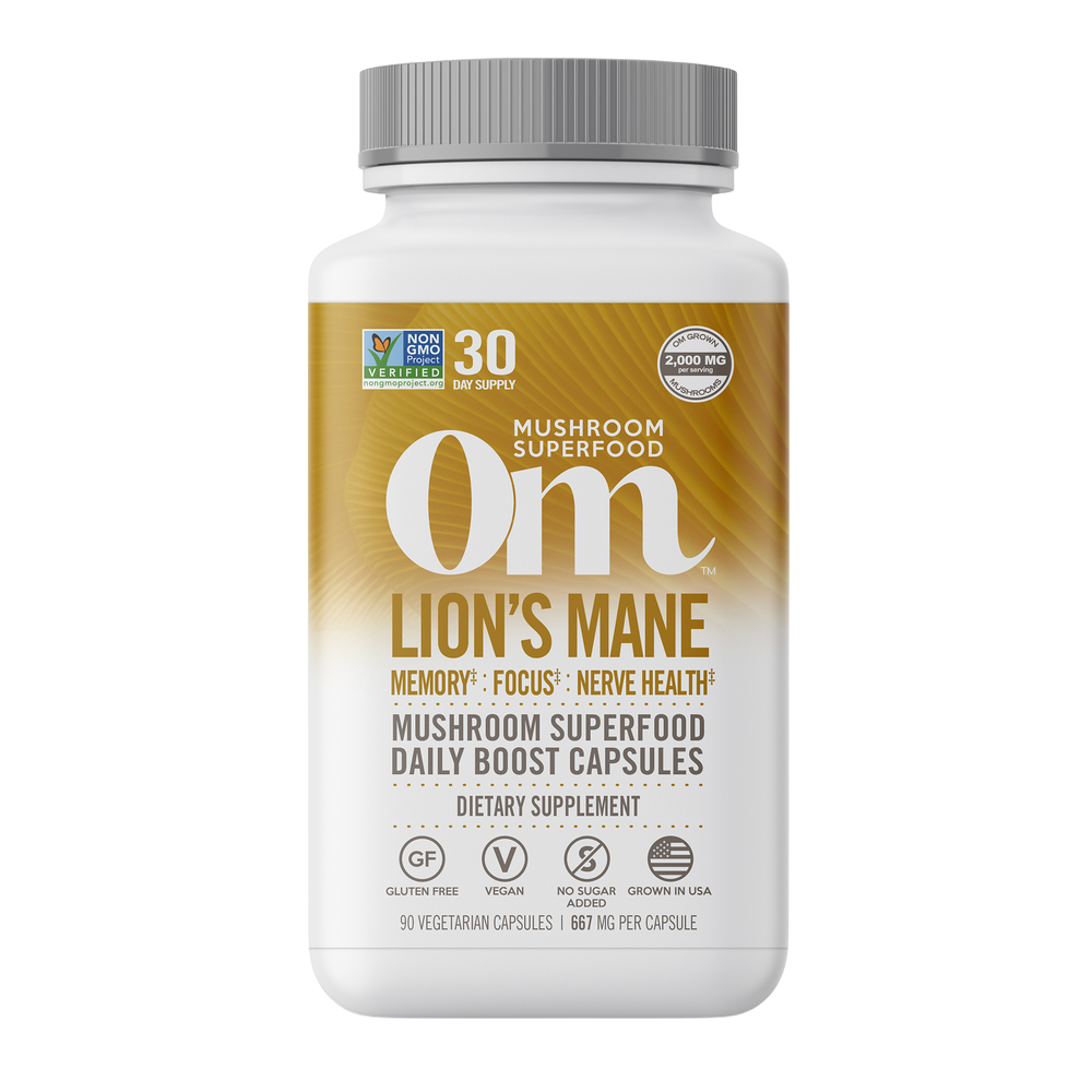 The smart mushroom. Lion’s Mane can help spark cognition, focus and clarity*. Om Lion’s Mane capsules are a smart way to help fuel your brain. Om Lion's Mane provides Organic Whole-Food Support: • Promotes mental clarity • Supports focus & alertness • 30 day support