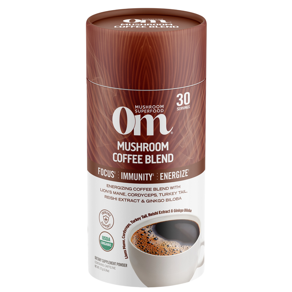Single origin, 100% Arabica coffee sustainably grown in Papua New Guinea with bold chocolatey notes and a rich full bodied taste. Combined with organic Lion’s Mane, Cordyceps, Turkey Tail and Reishi superfood mushrooms plus Ginkgo biloba for focus and vibrant health.‡ Each serving of Om Mushroom Coffee Blend contains 2,000mg of certified organic whole food mushroom powder + 100mg of Om proprietary Organic Reishi whole food extract standardized to 35% Beta Glucans.