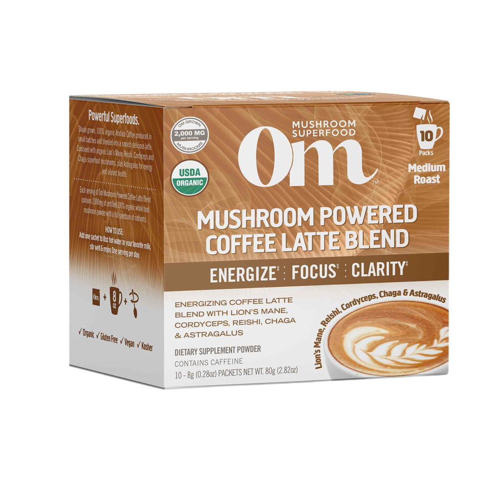 Energizing coffee latte blend with Lion's Mane, Cordyceps, Reishi, Chaga and Astragalus Shade grown, 100% organic Arabica Coffee produced in small batches and blended into a smooth delicious latte. Combined with organic Lion’s Mane, Reishi, Cordyceps and Chaga superfood mushrooms, plus Astragalus for energy and vibrant health. Each serving of Om Mushroom Coffee Latte Blend contains 2,000mg of certified 100% organic whole food mushroom powder with a full spectrum of nutrients.