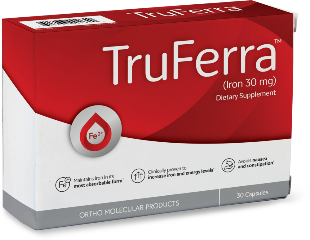 TruFerra™ provides effective support for iron repletion.* TruFerra™'s patented formula maintains iron in its most absorbable form and targets the body's natural site of iron absorption for enhanced bioavailability compared to other iron supplement forms. Specially formulated to be non-constipating and non-nauseating, TruFerra™ is less likely to cause gastrointestinal irritation, and is clinically studied to support iron levels, resulting in promoting energy and vitality. Iron supports healthy bodily functions such as the formation of hemoglobin for red blood cells, immune system activity, energy production and cognitive function.*