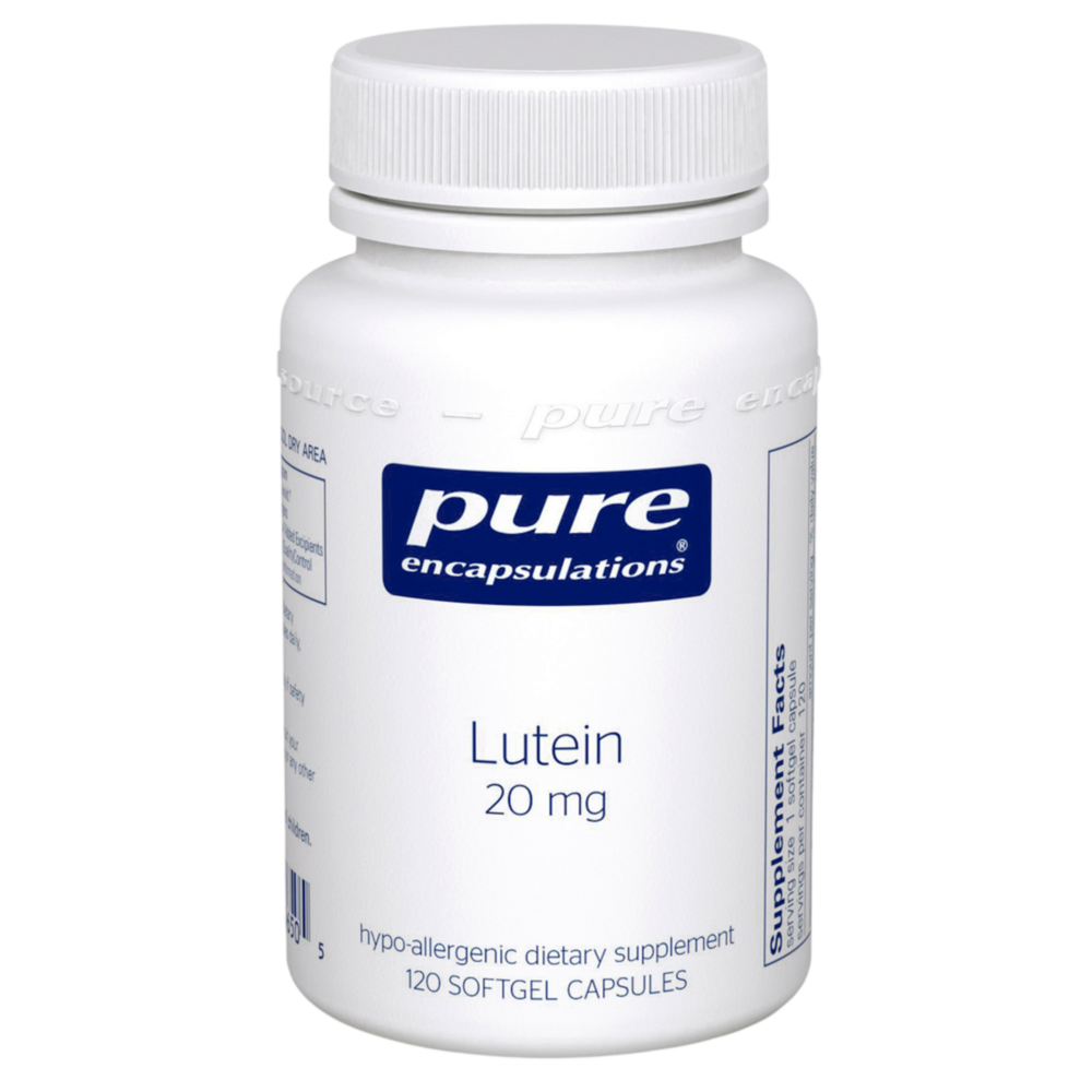 Lutein is a carotenoid found in a vast number of fruits and vegetables. Pure Encapsulations' free-form Lutein is structurally identical to the lutein found naturally in spinach and other leafy greens. Like other carotenoids, lutein has antioxidant activity in various tissues but is one of only two that are stored within the retina, where lutein promotes the integrity and density of the macular pigment, a key component of ocular health. Multiple clinical studies suggest a direct relationship between lutein supplementation and macula lutein concentration. Lutein uptake reportedly occurs in the receptor layer of the eye through a soluble carotenoid-binding protein called tubulin.