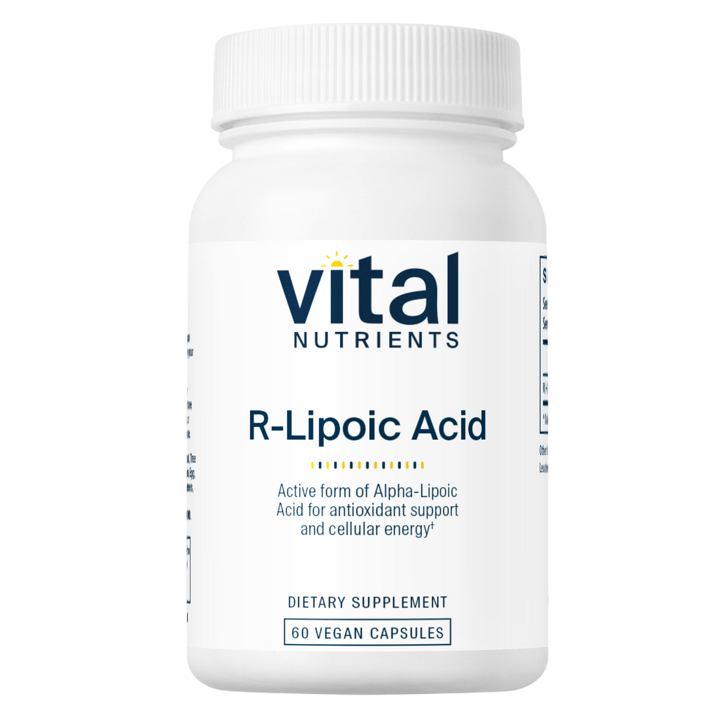 R-Form Alpha Lipoic Acid, a mitochondrial coenzyme, is the naturally occurring active form of Lipoic Acid. It has antioxidant properties that helps support normal metabolism and energy production.* Recent research suggests the R-Form may be the more effective form of Lipoic Acid.* Lipoic Acid plays an important role in maintaining healthy vision, peripheral nerve health and blood sugar levels that are already in the normal range.* Lipoic Acid is a potent liver detoxifier and protector, and may help promote the health and appearance of aging skin.* Vital Nutrients R-Form Alpha Lipoic Acid has been stabilized for storage at room temperature.