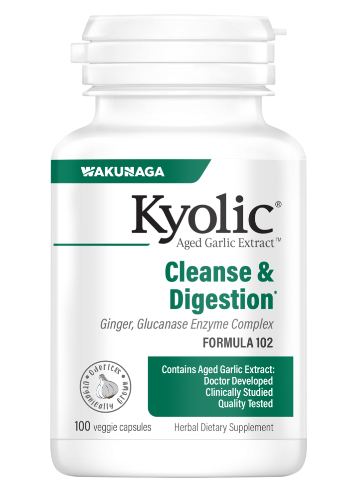 • Kyolic® Formula 102 herb and enzyme blend, contains a unique natural and synergistic combination Aged Garlic Extract™, Ginger, Glucanase, Lipase and Protease to support internal cleansing , healthy intestinal function and digestive balance.*