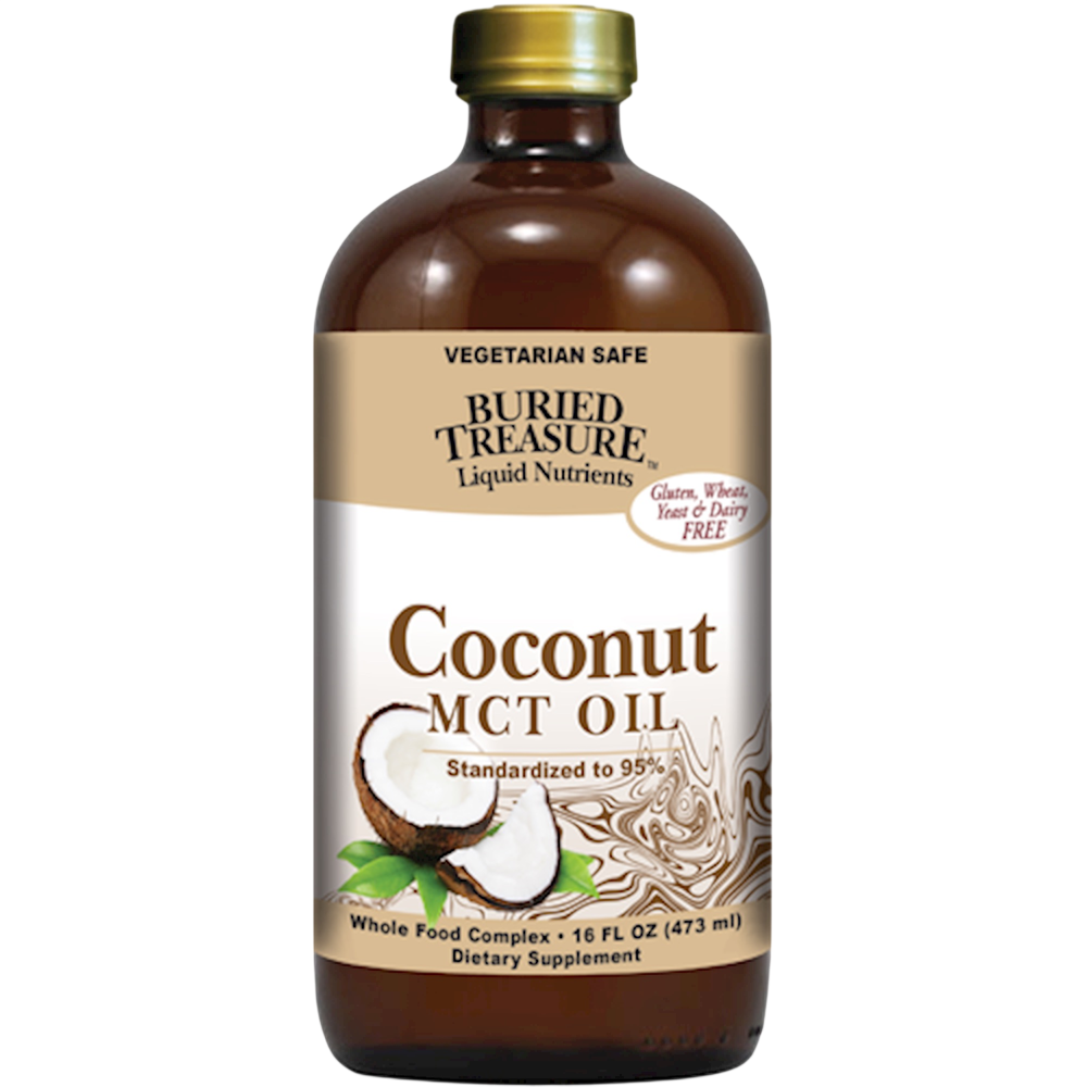 Buried Treasure MCT Coconut Oil for brain and metabolic support. Vegetarian safe. Liquid nutrients. MCT Standardized to 95%. Studies show that the Medium-chain triglycerides (MCT) like the ones in Coconut Oil have shown promise in providing nutrition for the brain. Superior nutrition improves cognitive performance. This natural food sourced coconut oil is most beneficial when used as a dietary supplement according to directions and in conjunction with a plant-based diet and active lifestyle.*