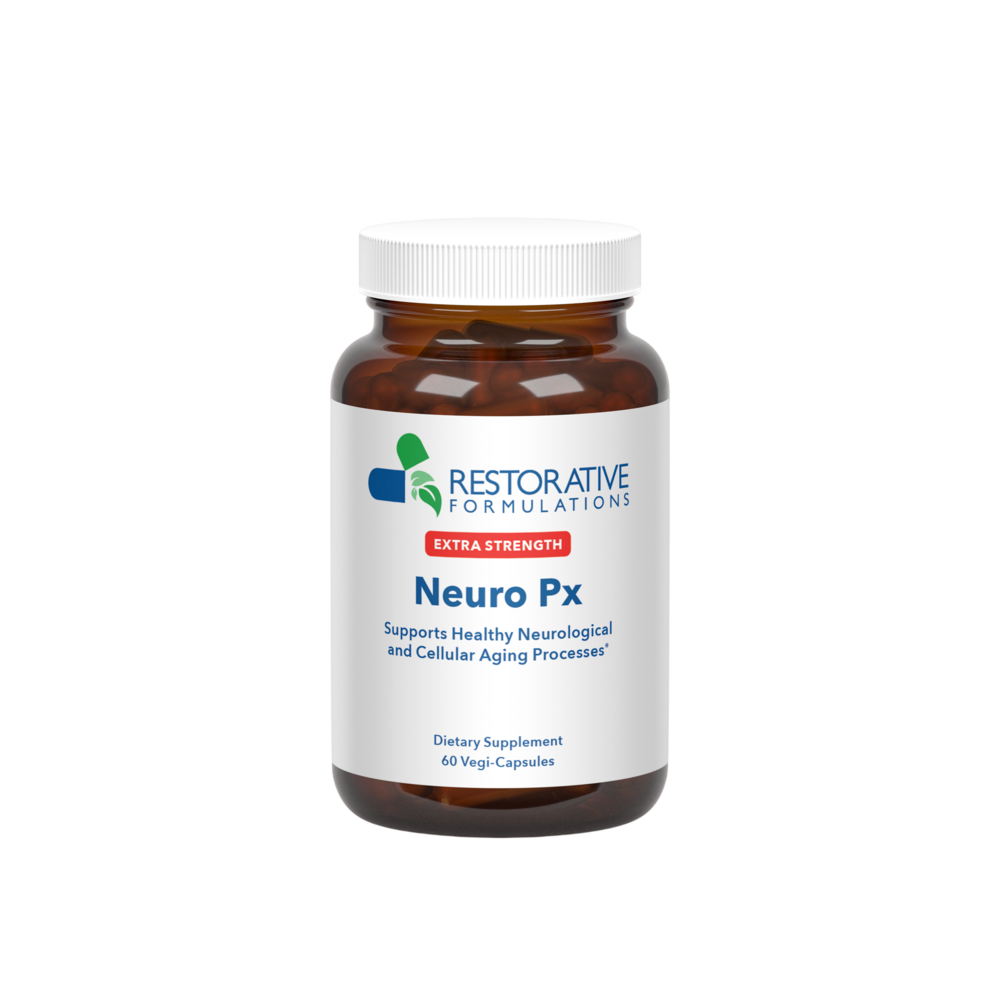 Neuro Px Extra Strength showcases a blend of specialized compounds targeting neurological health and cellular aging processes.Supports cell preservation, cellular energy production, bile acid-mediated signaling, and general metabolic health.Supports healthy endoplasmic reticulum stress inhibition and neurological autophagy processes.TUDCA (Tauroursodeoxycholic acid) can cross the blood-brain barrier to reach neuronal tissues, acting as a chemical chaperone to support healthy endoplasmic reticulum function.Nicotinamide riboside maintains healthy NAD+ levels safely.Organic Ashwagandha provides adaptogenic and stress-protective support and supports mental well-being.Pterostilbene helps reduce cellular stress and oxidative stress.TUDCA (Tauroursodeoxycholic acid) is able to cross the blood-brain barrier, acting as a chemical chaperone to support healthy endoplasmic reticulum function. TUDCA replicates bile acids, which are naturally produced in the liver and stored in the gall bladder. The gut microbiome can conjugate these bile acids into TUDCA. The human body makes a small amount, but the bears make copious amounts of it, and that is partly why they can hibernate so long without damage to their health. TUDCA is synthetically produced by conjugating ursodeoxycholic acid with taurine.Nicotinamide riboside, a precursor to NAD+(nicotinamide adenine dinucleotide), supports a natural pathway to NAD+. NAD+ acts as a coenzyme vital to cellular health and biological functions and is essential to the body’s energy production. Sirtuins, a group of proteins regulating cellular health, depend on this coenzyme. Both NAD+ levels and sirtuin function decline with age and can impact healthy neurological and cellular aging processes.Organic Ashwagandha provides adaptogenic and stress-protective support and supports mental well-being. It has been shown to help support cognitive function and concentration. Preliminary research suggests that ashwagandha may be neuroprotective by mitigating the effects of stress and protecting the nervous system.Pterostilbene is a phenolic compound found in small berries and nuts, including blueberries and grapes. Pterostilbene and resveratrol are structurally similar, but pterostilbene has better bioavailability and is included in the blend to help reduce cellular and oxidative stress.*Restorative Formulations' clean, pure formulas are free from magnesium stearate, binders, and artificial colors or flavors. We package exclusively in amber glass bottles, not plastic. All products are made in North America with ecologically sourced herbs, from the US whenever possible, harvested at peak potency to avoid solvents. Every lot is tested—raw materials and finished products—using HPLC by third-party labs.
