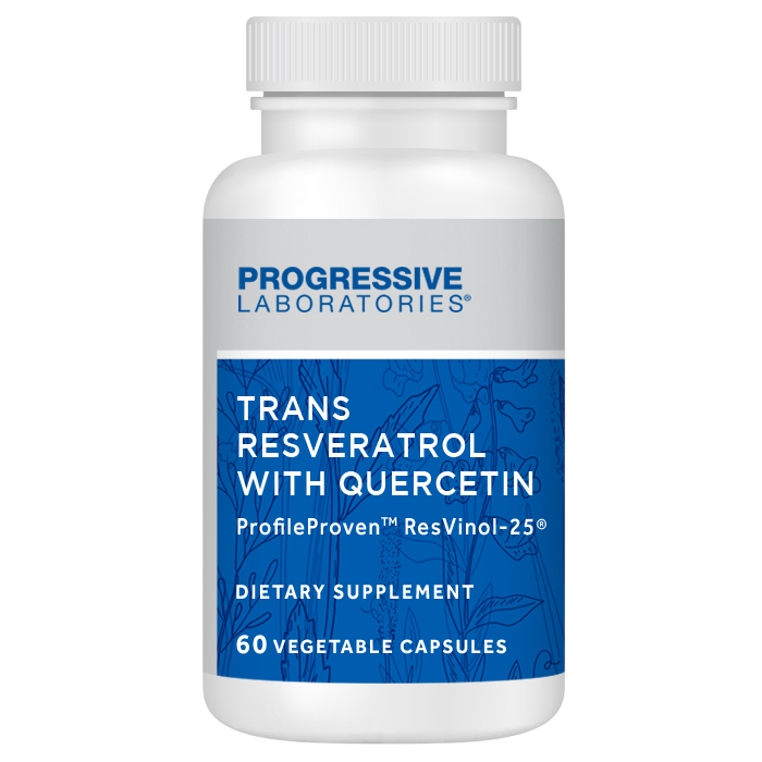 This is a specially developed formula of Trans-Resveratrol that consists of several quality sources of this natural ingredient. Resveratrol contains two isomers, cis-resveratrol and trans-resveratrol. Trans-resveratrol is the active form. No benefits have been associated with cis-resveratrol. By combining the best extracts of grape skins, red wine and Japanese knotweed, Progressive Laboratories has created a well-rounded product to support the nutritional needs of healthy aging.* Resveratrol occurs naturally in plants along with other polyphenols such as quercetin. Quercetin may enhance resveratrol’s bioavailability.